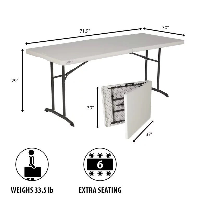Our 6 ft plastic rectangular folding table rentals complete any celebration! Each table can sit 6-8 people, and can be used as a grazing tables and gift tables. Each table weights 33.5 Lbs. It can be folded in half and has handles to be easily carried and set up.